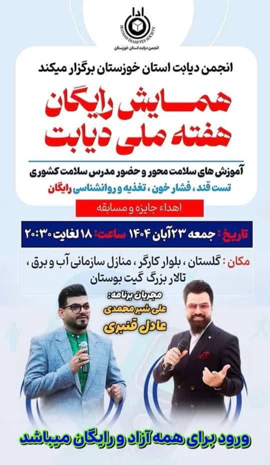 انجمن دیابت استان خوزستان تنها مجموعه‌ی مردم نهادی است  که در زمینه آموزش و پیشگیری دیابت در سطح  استان با محوریت کنترل و پیشگیری دیابت و با هدف آگاهی، شناخت و جلوگیری از ابتلا به دیابت  فعالیت دارد این انجمن هم‌اکنون با 78000  عضو گسترده‌ترین انجمن دیابت کشور است که تحت نظارت انجمن دیابت کشور و فدراسیون بین‌المللی دیابت در حوزه آموزش و کنترل عوارض دیابت مشغول به کار است . انجمن یاد شده از سوی فدراسیون بین‌المللی دیابت و وزارت بهداشت و درمان  مورد تجلیل قرار گرفته است.